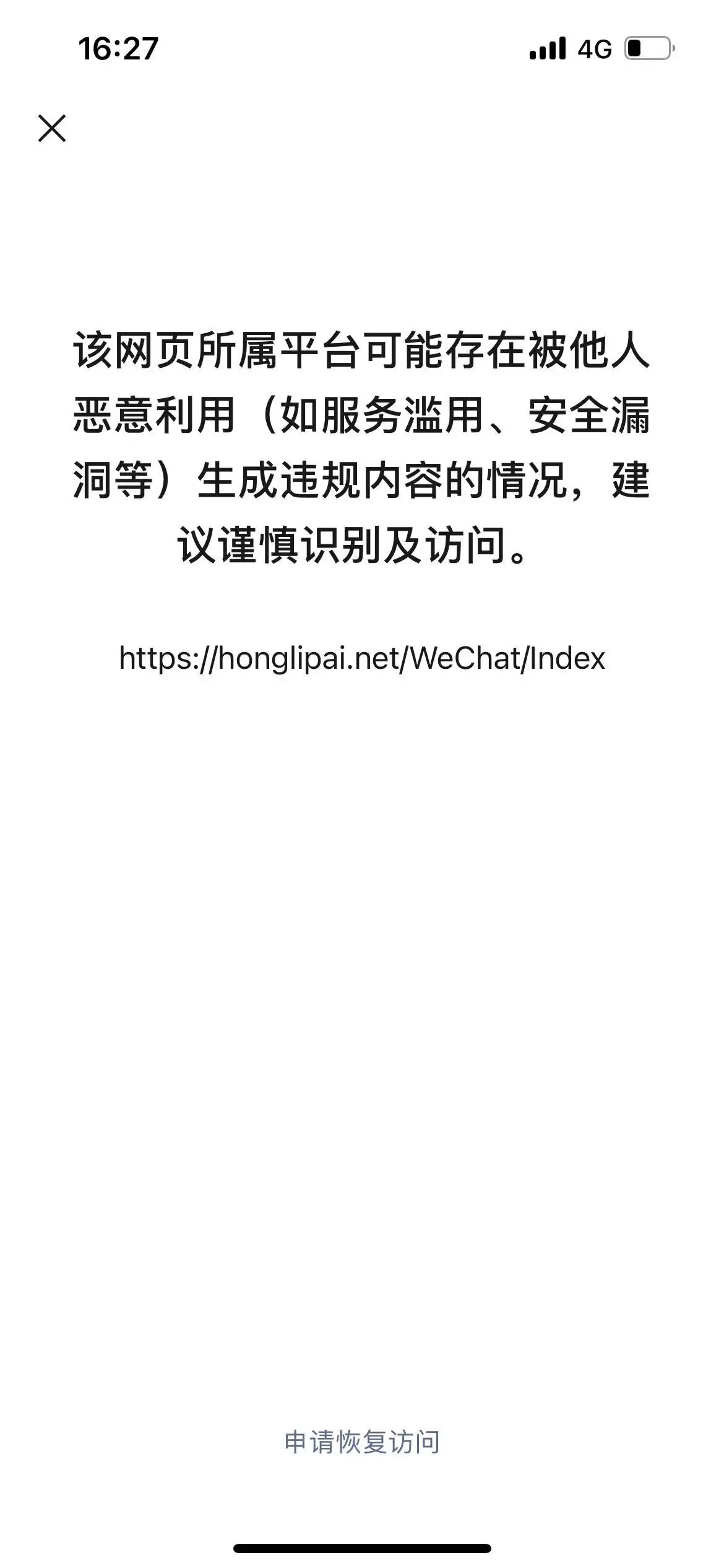 https://honglipai.net/WeChat/Index ,该网站为我公司官网网站,承办主体:洪力科技有限公司,有备案号,有电信增值业务许可证,通过微信转发链接时无法正常打开,目录也有验证文件,无不良信息,希望核实,谢谢!