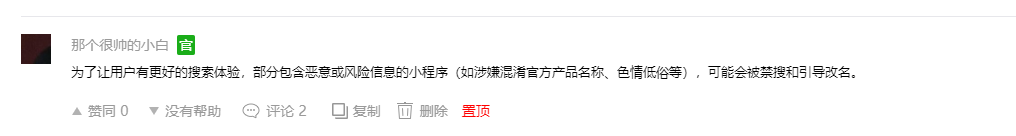 为了让用户有更好的搜索体验,部分包含恶意或风险信息的小程序(如涉嫌混淆官方产品名称、色情低俗等),可能会被禁搜和引导改名。