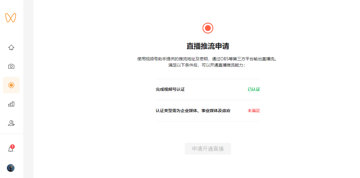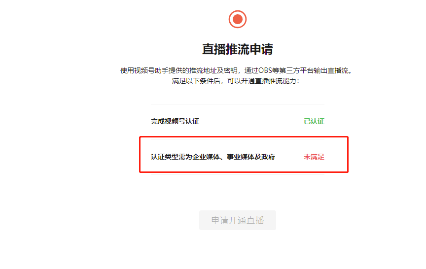 为了开视频号直播推流,特意注册了微信公众号并进行了认证,绑定企业后认证通过。却还是没有开放权限!想问下该怎么处理?