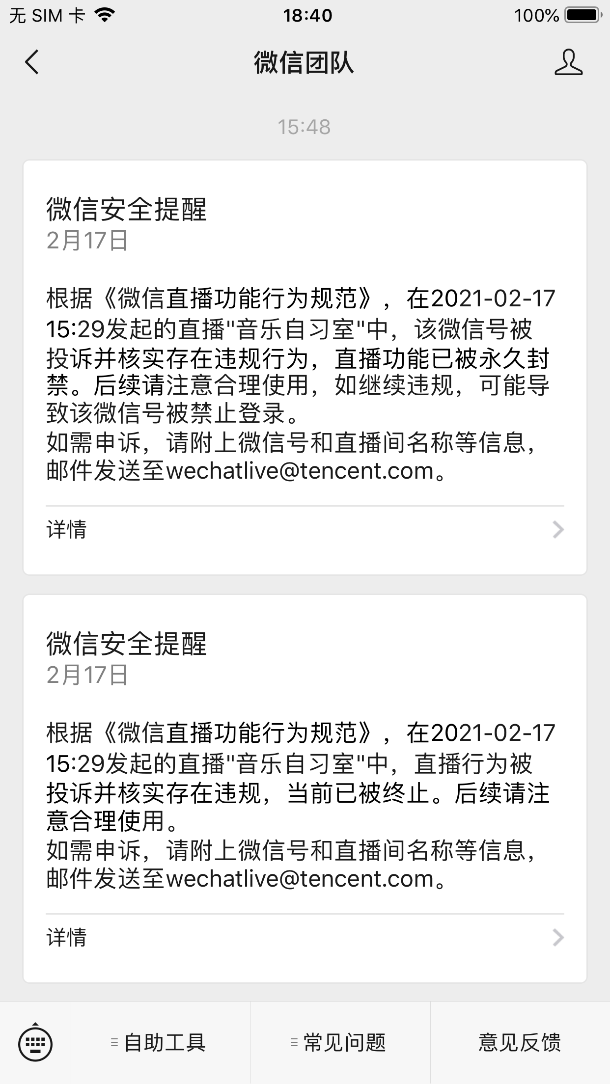 我在直播的时候莫名其妙的被别人举报,还被永久禁播了!我一直在写作业!穿的是正常的衣服!一句话都没有说!只是放了几首纯音乐!