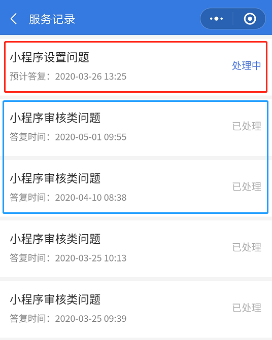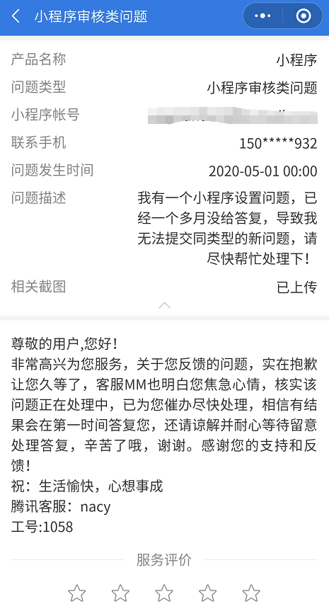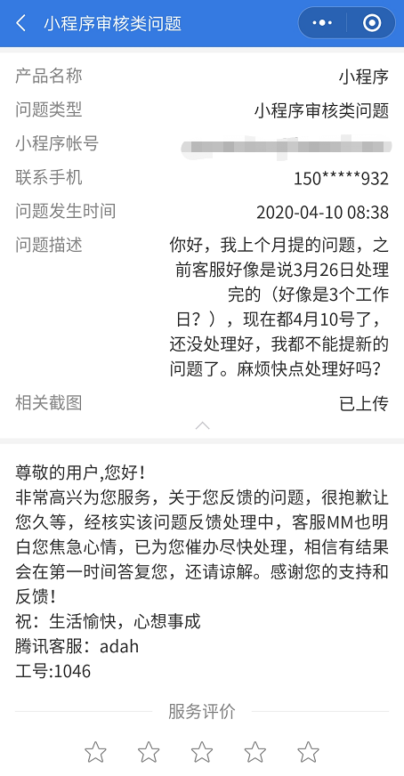 于是我在4月10日和5月1日,又分别提交了一个“小程序审核类问题”,内容则是关于上面那个问题一直未处理的,希望尽快办理。