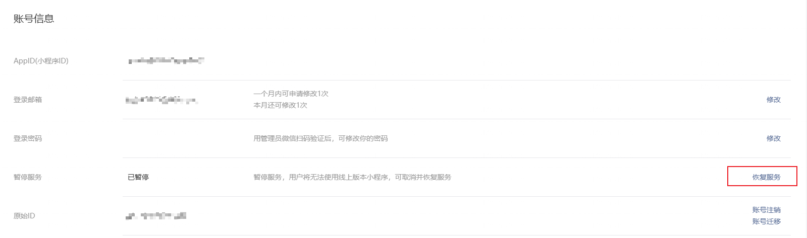 之前有暂停小程序服务,现在需要恢复服务,但是扫码一直报错