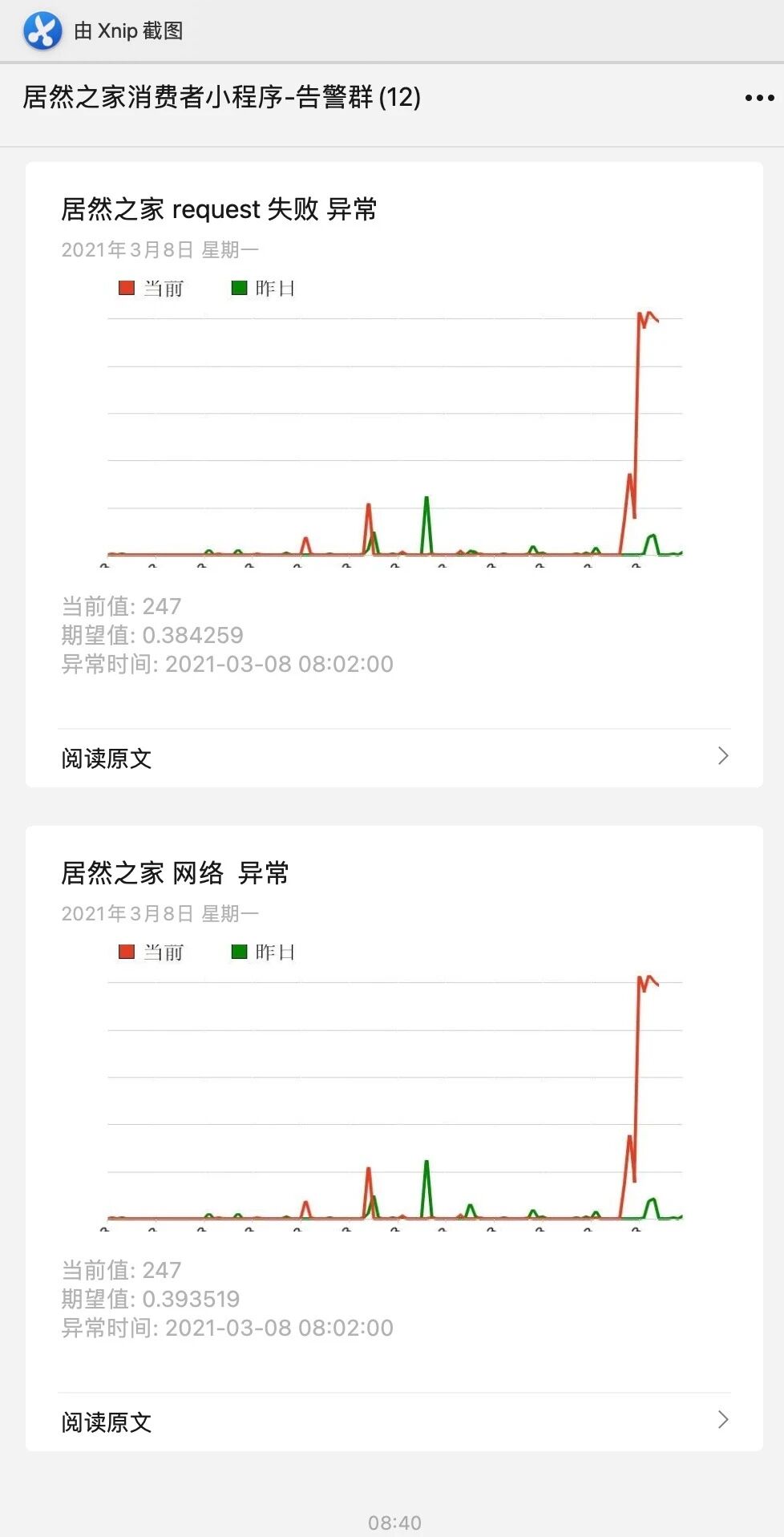 3月8日早8:07 ,小程序告警群推送两条告警,但登陆小程序管理后台查看监控告警,并未发现任何异常,请确认是误报警还是其他问题