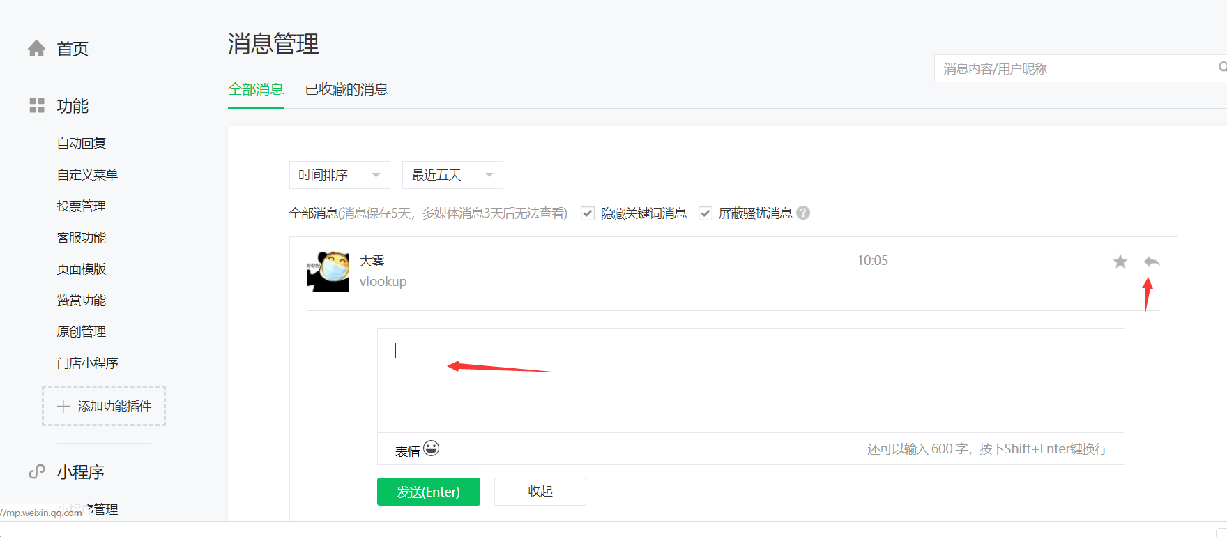 就是这种,不是被动回复消息。是我们开发者主动回复消息。这个接口在哪里,开发者文档没看到。被动回复客户需要在5秒内相应。但是我这操作没那么快
