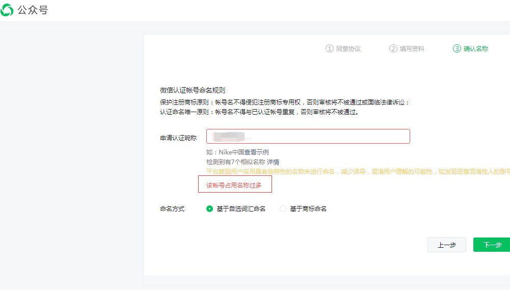 *情况说明:原来我公众号的昵称是AAA(化名),由于业务变动,我准备修改为BBB,且BBB我已经有了商标证书且BBB的昵称未被占用,从规则来讲我完全可以进行修改昵称的。但是我就是修改不了,至少我触发修改的输入框时,就提示红色的提示语:该账号占用昵称过多。