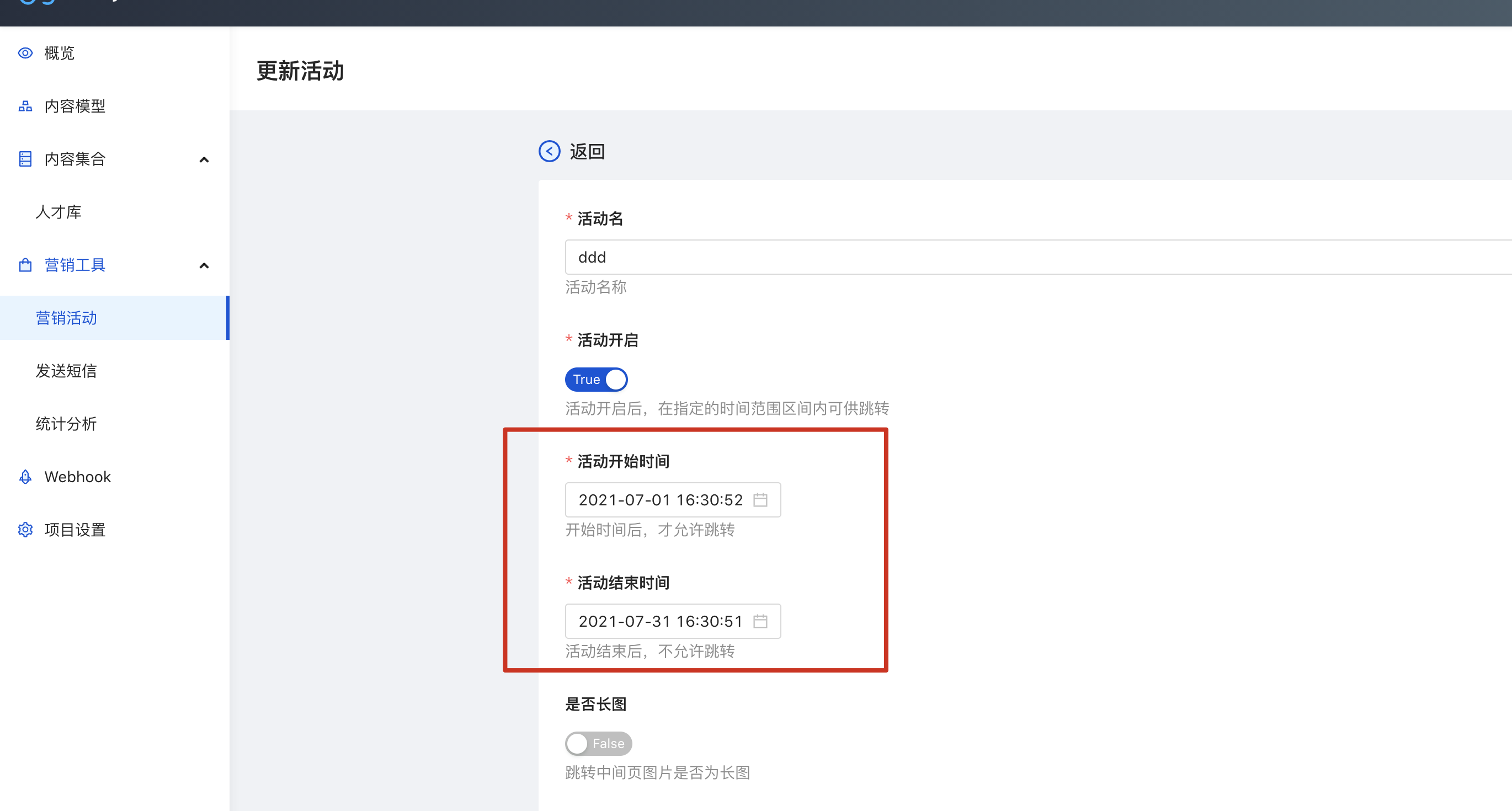 进入项目详情后,我们发现左侧栏会有【营销工具】,我们点击其中的营销活动
