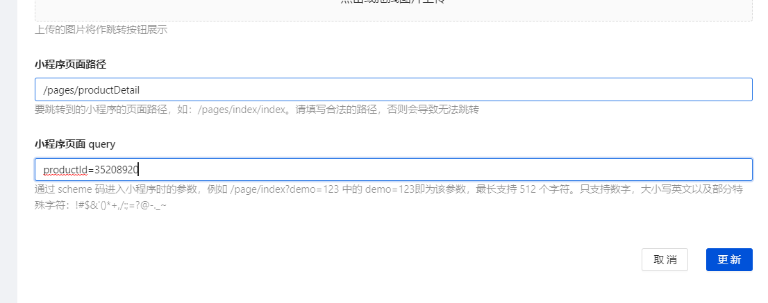 - 小程序跳转参数:附带路径的传入参数,一般配合小程序代码联动。