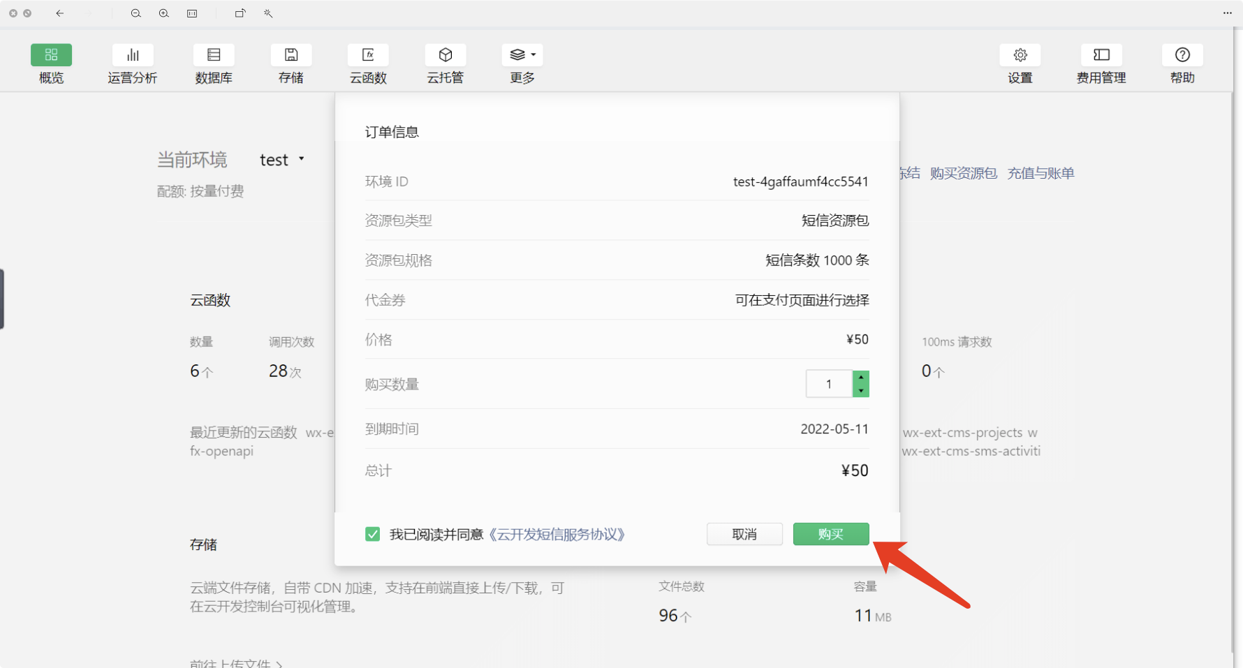 此时只需要点击开通按钮,并在弹出提示框中同意【服务协议】,即可开通云开发。
