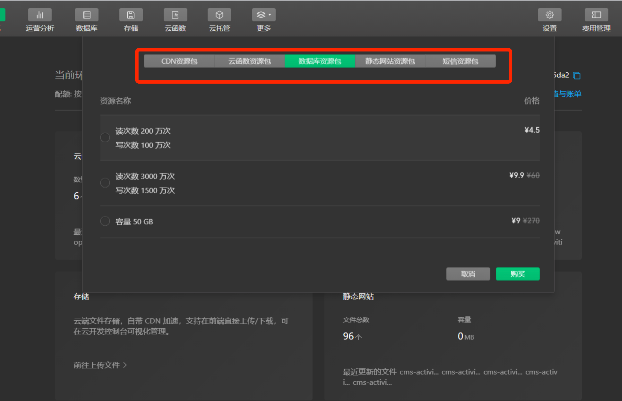 - 短信发送能力的体验是每个有免费配额的环境首月100条,如有超过额度的需求可前往开发者工具-云开发控制台-对应按量付费环境-资源包-短信资源包,进行购买。如当前资源包无法满足需求也可通过云开发 工单 提交申请