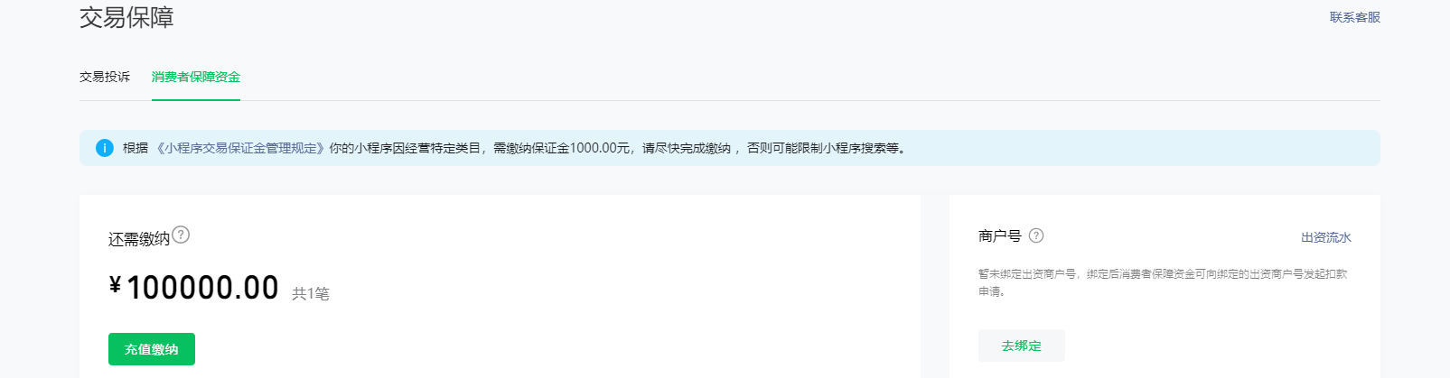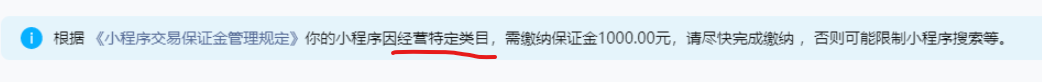 经营特定类目会触发缴纳保证金机制,详情请查看小程序交易保证金管理规定https://developers.weixin.qq.com/miniprogram/dev/platform-capabilities/business-capabilities/ministore/minishopopencomponent2/baozhengjin.html