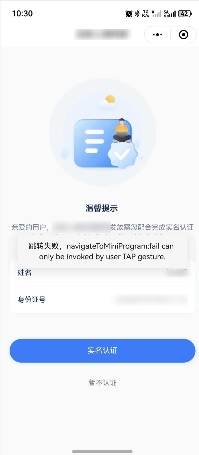 如上图的流程演示:用户点击实名认证后,会拉起用户的授权手机号弹窗,完成授权手机号后会跟后台换取跳转微工卡小程序的地址。安卓/iOS完全正常,只有鸿蒙设备不支持。