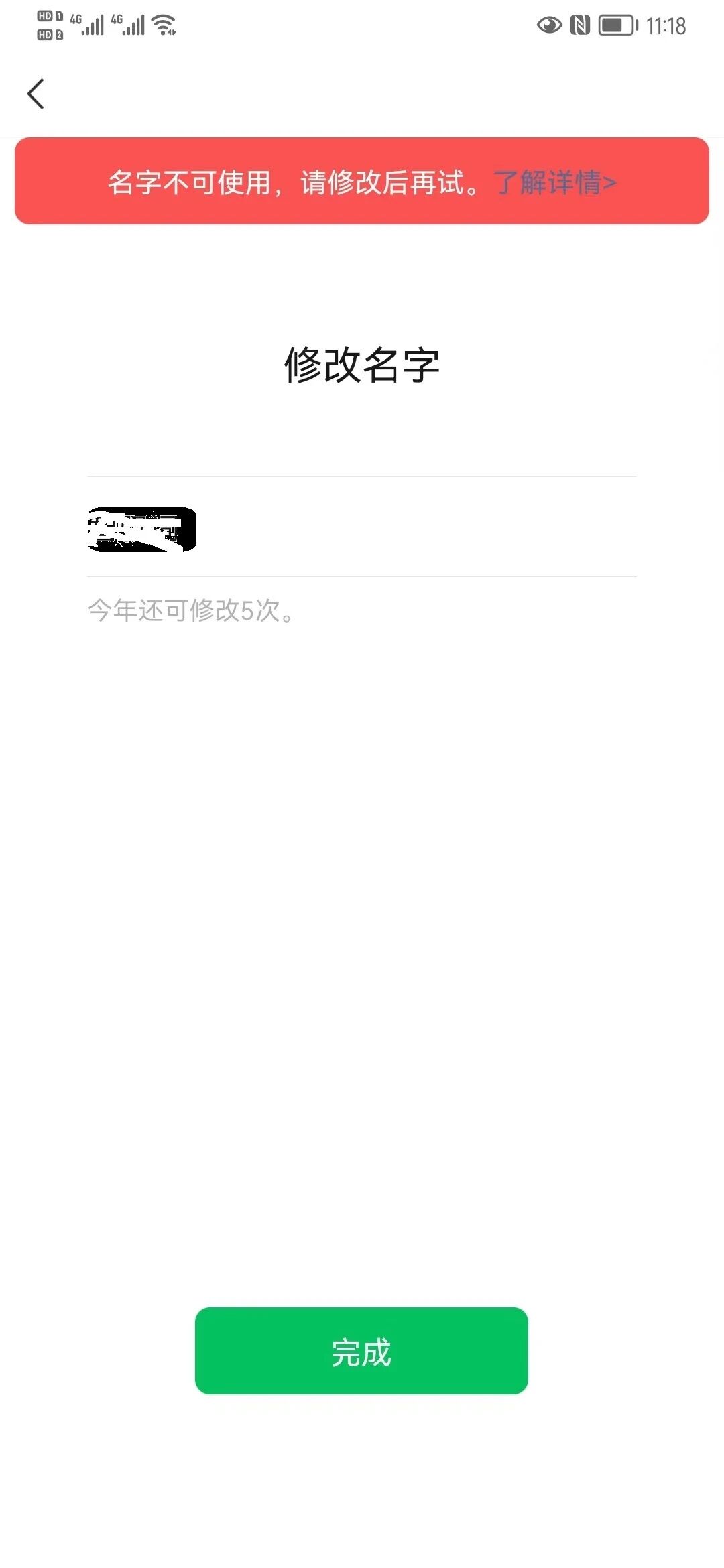 点击“了解详情”后,提示入下信息:“你设置的名字受到保护(常用语/商标/名人名字)可提交归属证明资料或返回修改”