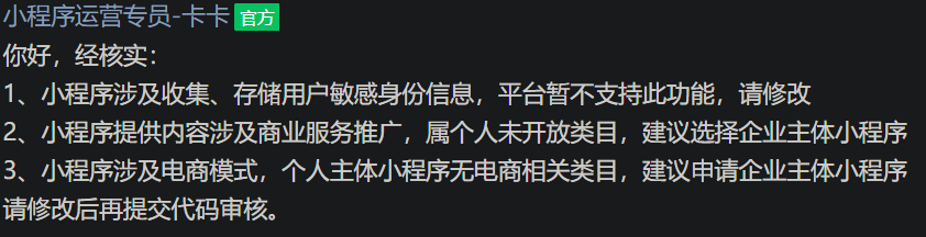 "你好,你的小程序涉及收集、存储用户敏感身份信息,平台暂不支持此功能,请修改。"请问这句话的意思是个人主体不支持吗?必须是企业主体?