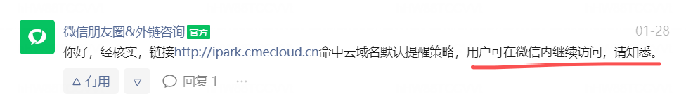 你好,经核实,链接https://ipark.cmecloud.cn/命中云域名默认提醒策略,用户可在微信内继续访问,请知悉。