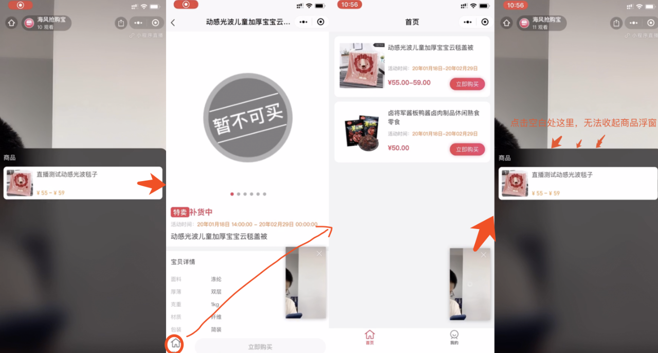进入小程序直播——点开商品图标——进入商品详情(此时直播变为小窗)——再从商品详情的连接进入其他商品页面——点击直播小窗返回直播页面——点击空白处,商品浮层无法消失。