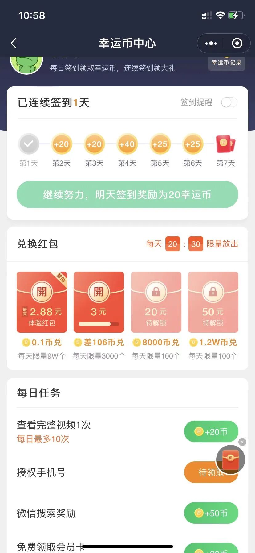 图2每日看视频,微信搜索都可以获得幸运币,幸运币可以兑换红包,这种情况也不违规吗?不违规是因为兑换的红包是随机的奖励并不是固定的奖励吗?还是做与小程序体验转发不相关的小任务获得现金奖励是合规的?
