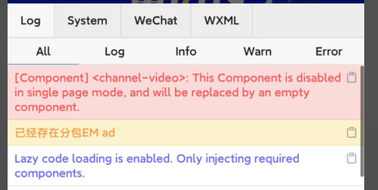 含有channel-video的小程序页面分享到朋友圈,iPhone13、荣耀v20(微信版本8.0.56)点击分享卡片打开小程序页面能正常展示视频号视频,小米11(微信版本8.0.49)点击分享卡片打开小程序页面不展示该模块,报错如下图。