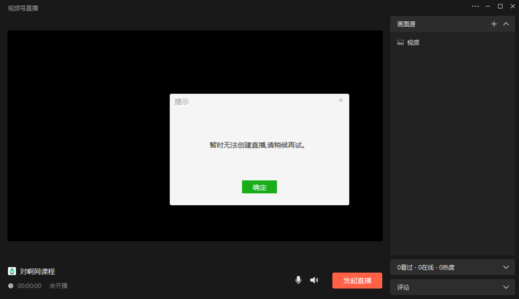 PC端微信视频号直播功能无法使用,提示‘暂时无法创建直播,请稍后再试’,也无任何提示表明账号有封禁处理(手机端可正常使用)。此状态已持续半个多月,一直未得到解决,请问是怎么回事呢? 微信账号:duia202004 微信视频号:对啊网课程