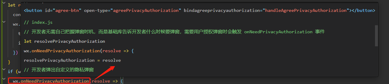 // example.wxml <button id="agree-btn" open-type="agreePrivacyAuthorization" bindagreeprivacyauthorization="handleAgreePrivacyAuthorization"></button> // index.js // 开发者无需自己把握弹窗时机,而是基础库告诉开发者什么时候要弹窗,需要用户授权弹窗时会触发 onNeedPrivacyAuthorization 事件 let resolvePrivacyAuthorization wx.onNeedPrivacyAuthorization(resolve => { resolvePrivacyAuthorization = resolve // 开发者弹出自定义的隐私弹窗 // showCustomPrivacyAuthorization() }) Page({ handleAgreePrivacyAuthorization() { resolvePrivacyAuthorization({ buttonId: 'agree-btn', event: 'agree' }) // 用户点击同意后,开发者调用 resolve({ buttonId: 'agree-btn', event: 'agree' }) 告知平台用户已经同意,参数传同意按钮的id // 为确保用户有同意的操作,基础库在 resolve 被调用后,会去检查对应的同意按钮有没有被点击过。检查通过后,相关隐私接口会继续调用 // 用户点击拒绝后,开发者调用 resolve({ buttonId:'disagree-btn', event:'disagree' }) 告知平台用户已经拒绝 } })