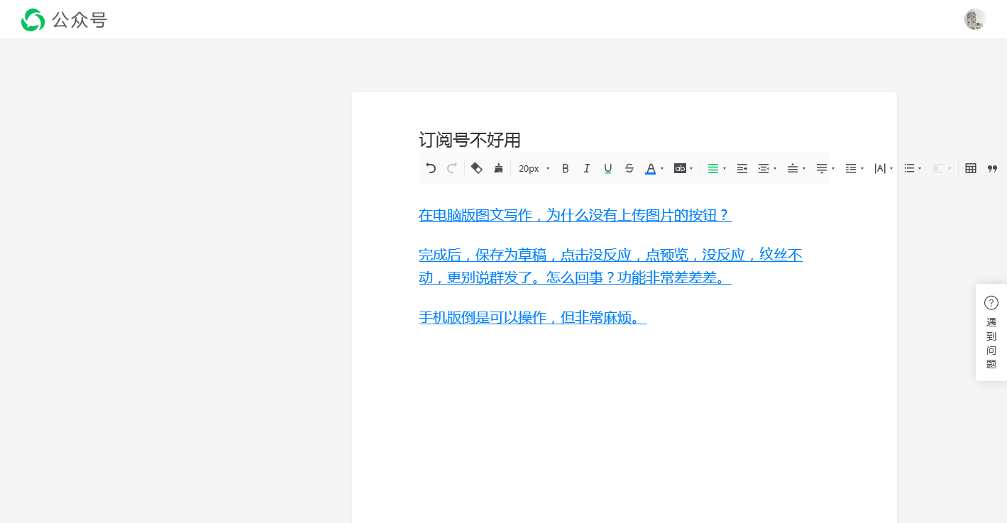 输入图文后,点击保存为草稿或预览,都纹丝不动,没有提示,没反应