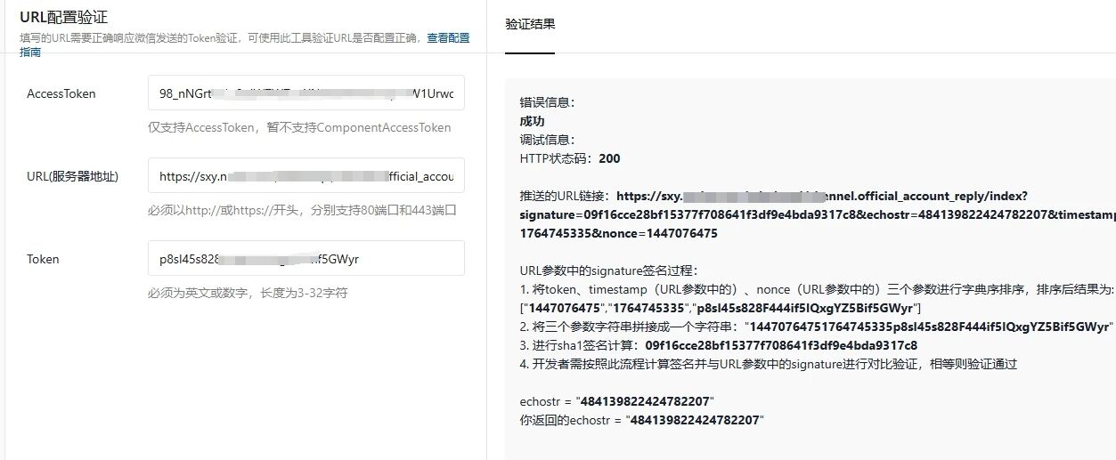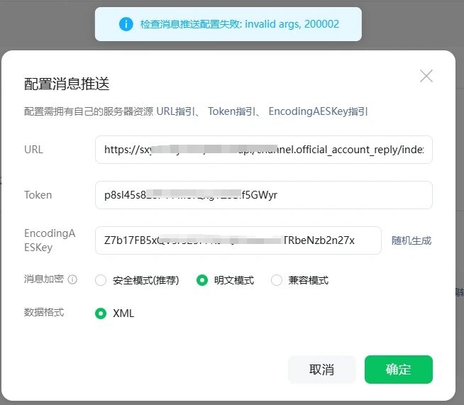 通过调试工具是可以的,但是通过消息推送配置,一直提示配置不成功invalid args, 200002。