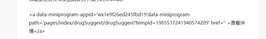 <a data-miniprogram-appid='wx1e9f26ed245fbd19'data-miniprogram-path='pages/index/drugSuggest/drugSuggest?tempId=1985537241940574209' href='' >查看详情</a>