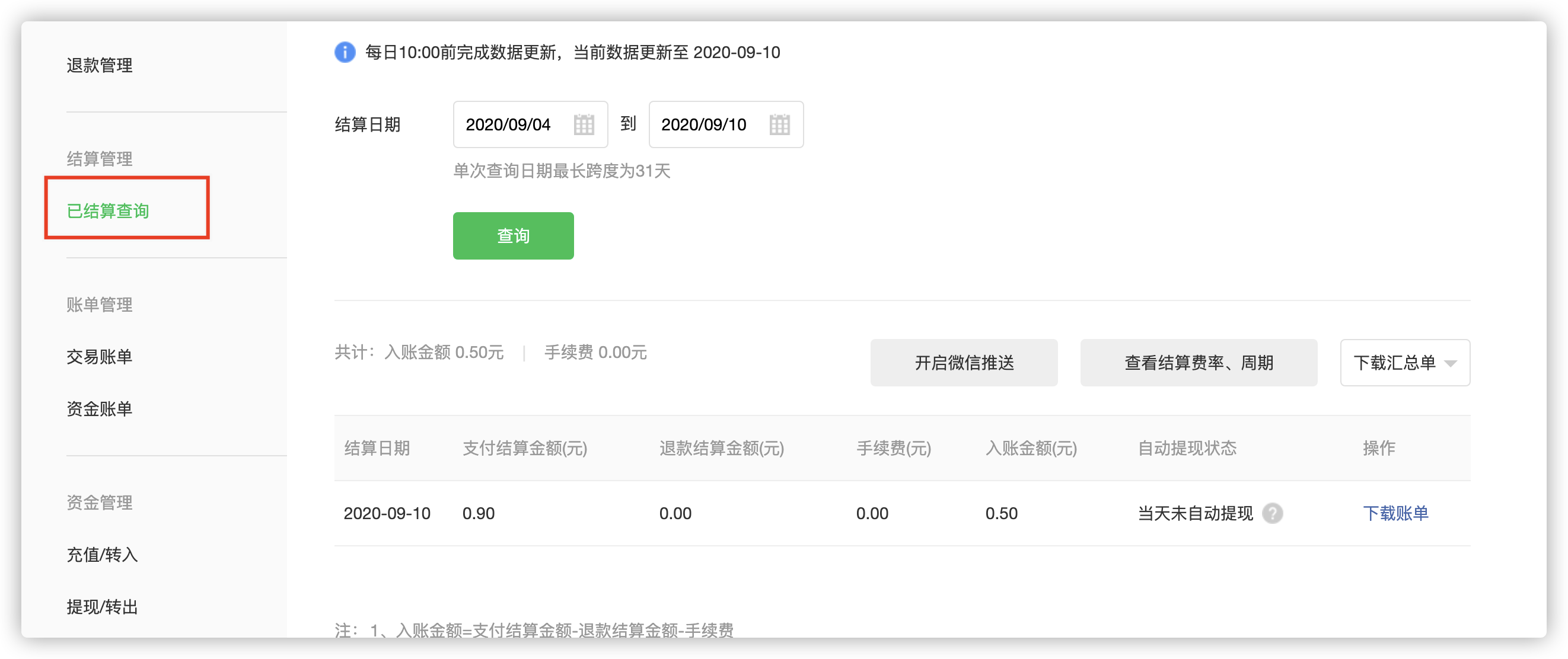 4,商户开通了收支分离但手续费账户余额不足(手续费账户最低余额要求是100元以上,在充值手续费账户1小时后,订单会正常结算,即可正常调用分账接口)