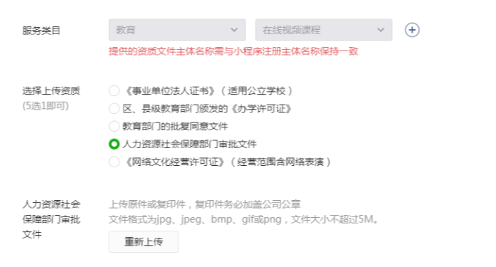 我司使用小程序开发功能,涉及到有在线视频类;现提交审核由于服务类目缺少“在线视频类”审核未通过;现在咨询上传资质的5类文件办理情况,或者提供一下样品截图。