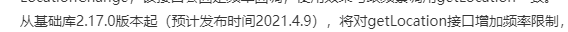 从基础库2.17.0版本起(预计发布时间2021.4.9),将对getLocation接口增加频率限制,包括: