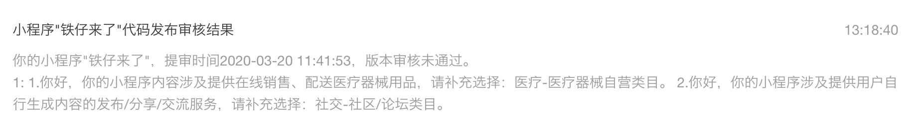 你好,你的小程序内容涉及口罩预约购买服务,请补充选择:医疗-医疗器械自营类目或政务民生类目,或请去除相关内容后再提交代码审核。