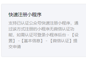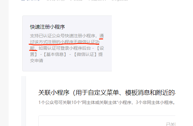 注意看这里哈。目前通过公众号快速注册的小程序无微信认证功能,小程序也不支持复用公众号认证资质;如果小程序需要认证,只能另外付费申请认证。