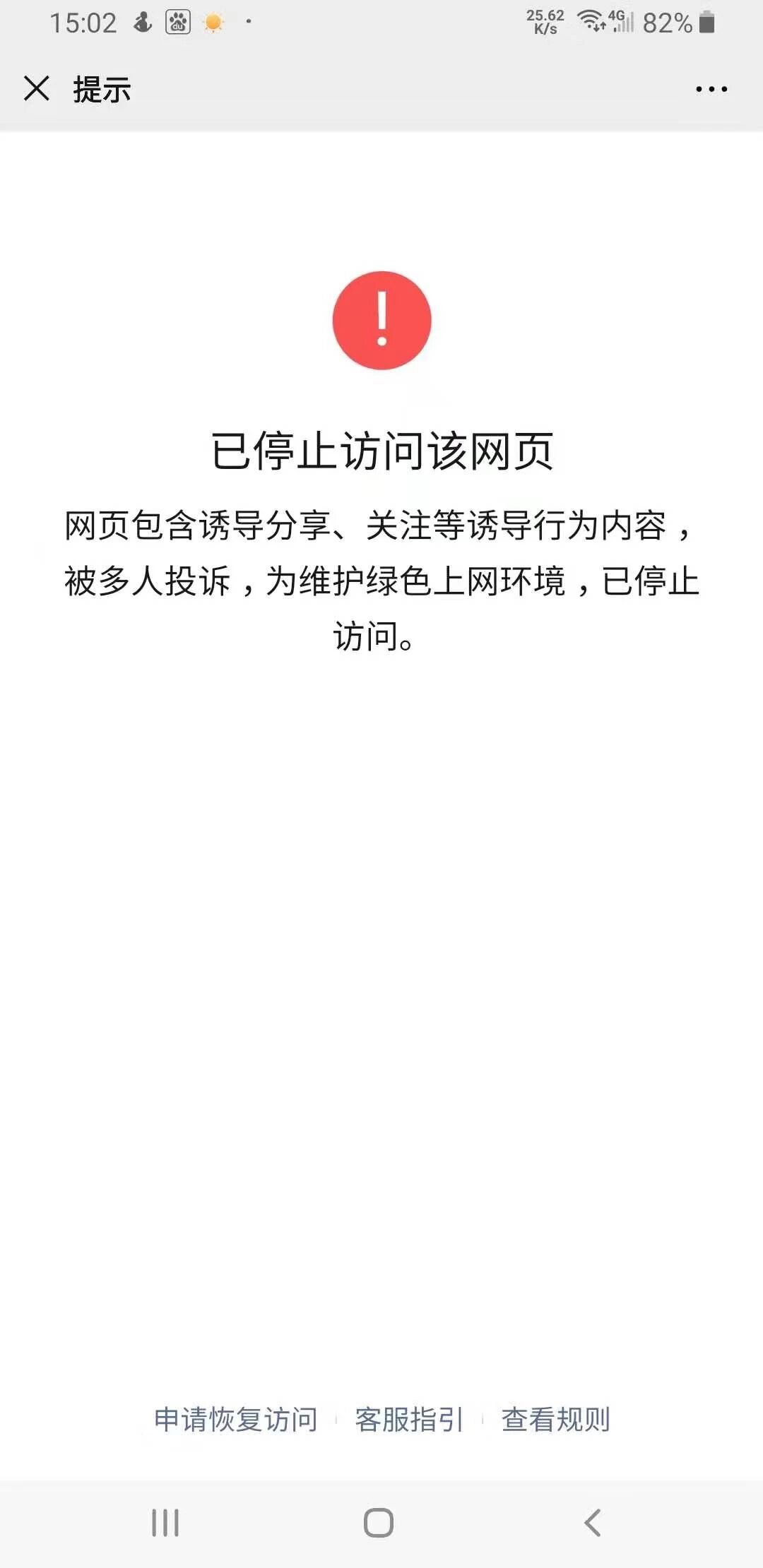 具体违规情节:违反了《微信外部链接内容管理规范》 1.2 通过利益诱惑,诱导用户分享以及传播外链内容的,包括但不限于:以金钱奖励、实物奖品、虚拟奖品(包括但不限于红包、优惠券、代金券、积分、话费、流量、信息);声称分享可增加抽奖机会、中奖概率、成功可能;通过签到打卡、邀请好友协助(包括但不限于助力、砍价、加速)、设置收集任务(包括但不限于集赞、集卡、集福、集碎片)等形式利诱、诱导用户分享以及传播外链内容的;