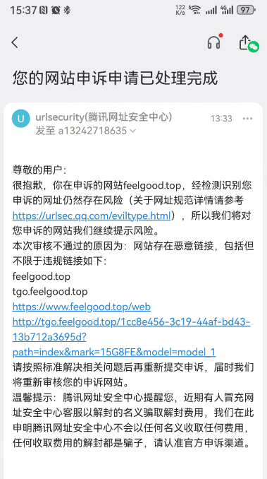 提交腾讯安全中心,驳回原因是含外链,已经检查并删除链接重新提交了(点击安全平台发的链接是空白没内容的),还是提示有风险。