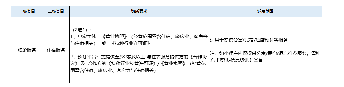 你好,若小程序属于住宿服务的预订平台需提供:至少2家及以上 与住宿服务提供方的《合作协议》 及 合作方的《特种行业许可证》(经营范围含“旅馆业”)/《营业执照》(经营范围含住宿、旅店业、客房等与住宿相关)申请类目。