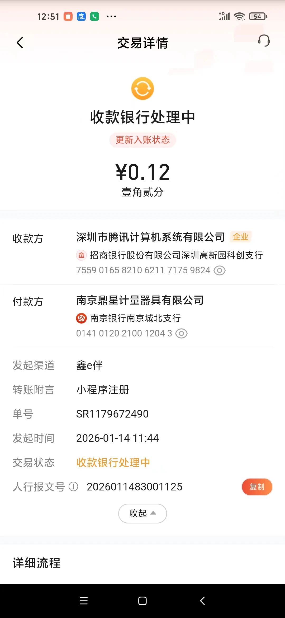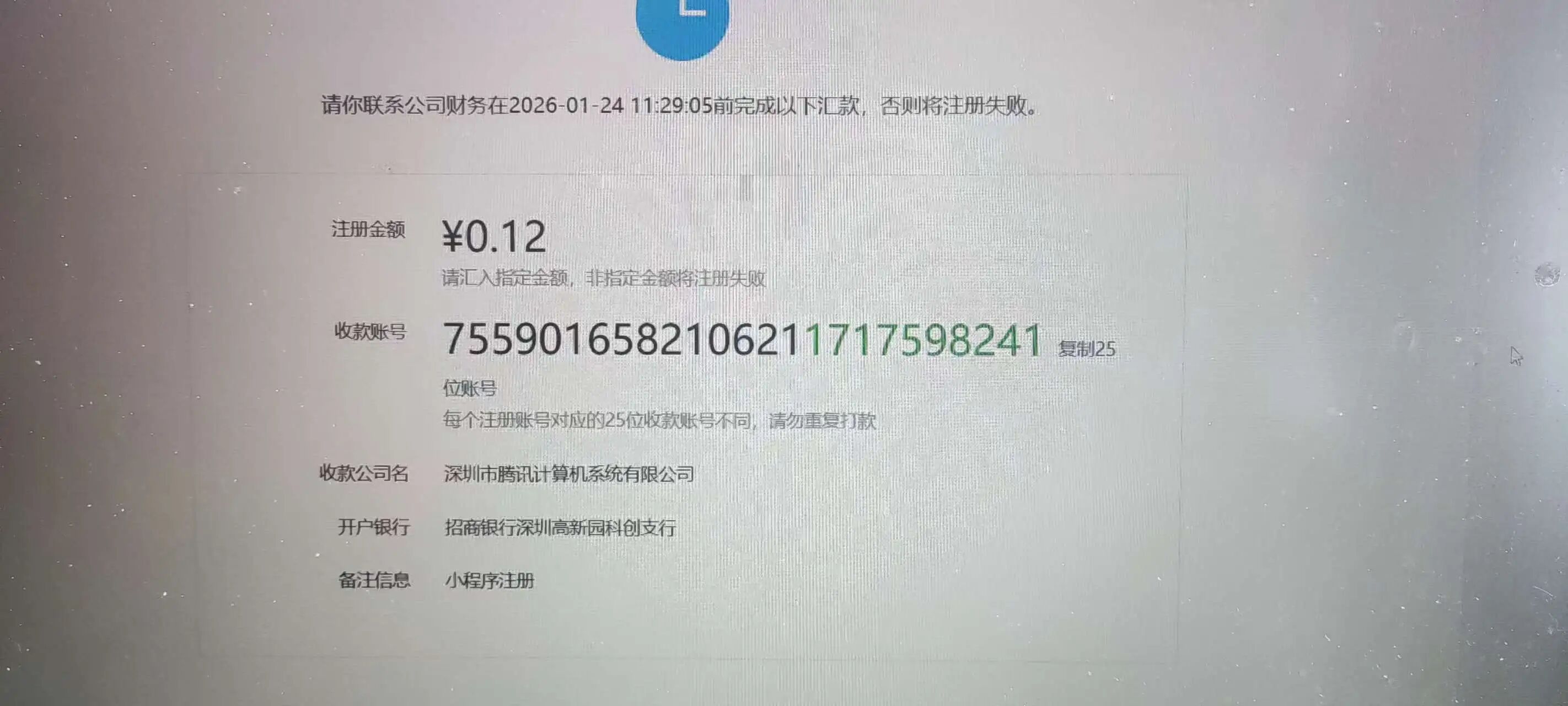 我司于2026 年 1 月 14 日通过对公账户(南京银行南京城北支行)向腾讯指定收款账户打款0.12 元,用于完成小程序注册的小额打款验证。