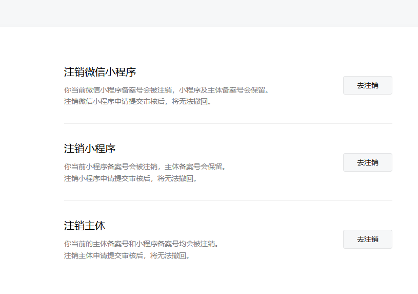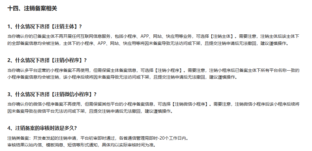 因注销是不可逆转的操作,建议请自行确认注销需求,避免造成不必要的损失,注销区别请参考:https://developers.weixin.qq.com/miniprogram/product/record/record_faq.html#%E5%8D%81%E5%9B%9B%E3%80%81%E6%B3%A8%E9%94%80%E5%A4%87%E6%A1%88%E7%9B%B8%E5%85%B3
