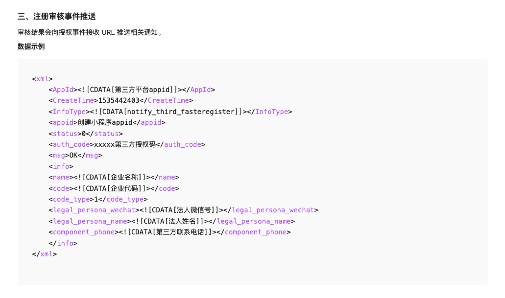你好,第三方平台授权事件接收配置URL地址是:https://7.yixuansoft.cn/app/00rewrite.php?c=entry&m=yx18900&i=2&themeid=1&do=service&soft=yHbwLXNx6,并不是上面提供的。请仔细检查服务器消息,注册小程序成功/失败事件都是正常推送的