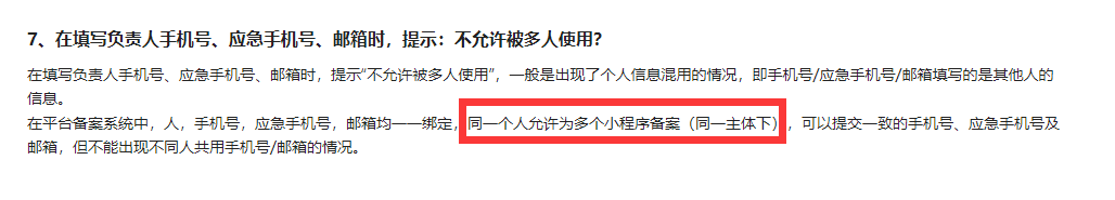 不知道是不是我的第一个备案还没有通过,我怎么填手机号码都不会提示我手机号被多人使用。这个多人使用应该怎么理解,同一个姓名同一个手机号在多个小程序中使用,算不算多人使用?