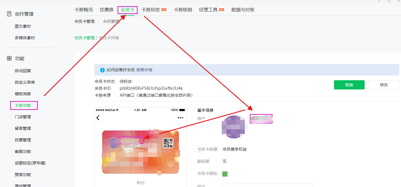 通过微信公众号-卡券功能-会员卡-修改方法,成功将微信会员卡的项目名称、会员卡底图、商户Logo进行更新。