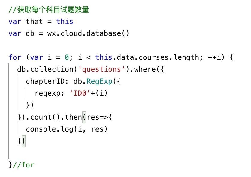 //生成查询Promise数组Promise.all(this.data.courses.map(function(item, i){returndb.collection("questions").where({chapterID: db.RegExp({regexp:"ID0"+ i})}).count();})).then(function(resultList){console.log(resultList);//按查询的数组顺序输出})这个意思?