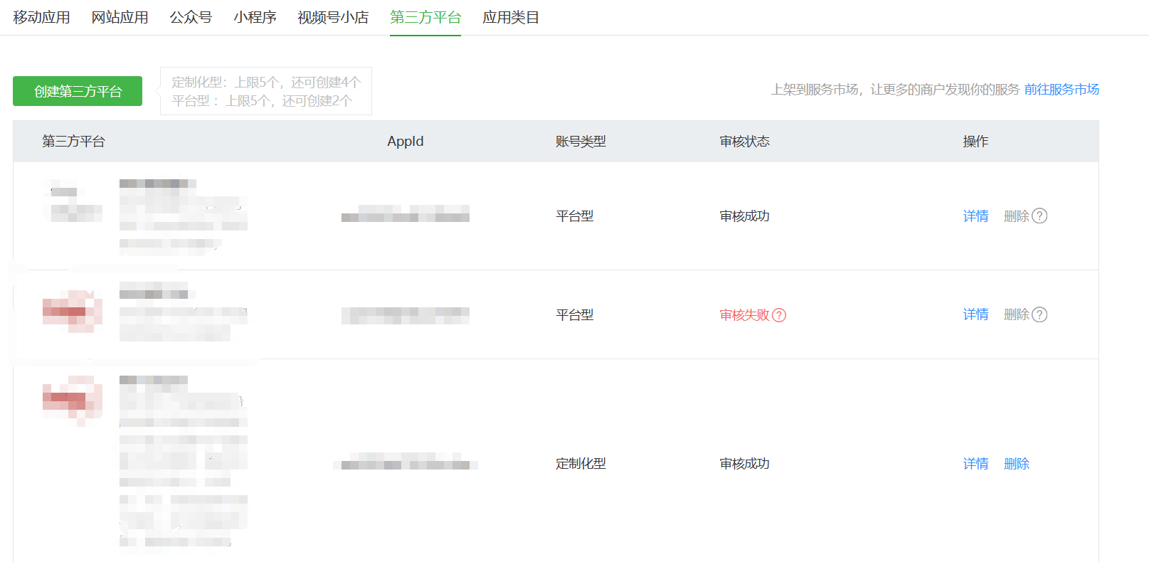微信小程序这个地方。我们目前是第三方服务商,并且待开发小程序中也绑定了客户的小程序,但是现在小程序的更多资料中还是看不到我们。这个是什么原因?是账号类型(平台型/定制化型)的原因?还是因为没有上架到服务市场?