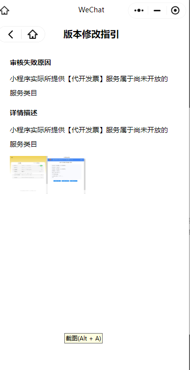 小程序没有【代开发票】这个服务类目,参考文档:https://developers.weixin.qq.com/miniprogram/product/material/#%E9%9D%9E%E4%B8%AA%E4%BA%BA%E4%B8%BB%E4%BD%93%E5%B0%8F%E7%A8%8B%E5%BA%8F%E5%BC%80%E6%94%BE%E7%9A%84%E6%9C%8D%E5%8A%A1%E7%B1%BB%E7%9B%AE,请重新定位小程序功能