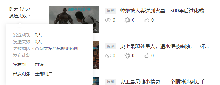 这样群发总是失败怎么回事?发送不出去,视频是原创,在头条。企鹅号都是原创,坑定不是视频的事