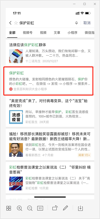 比如搜索保护彩虹,会先搜到一个中转小程序,打开这个小程序他会告诉你 发现->小程序->保护彩虹 再打开目标小程序