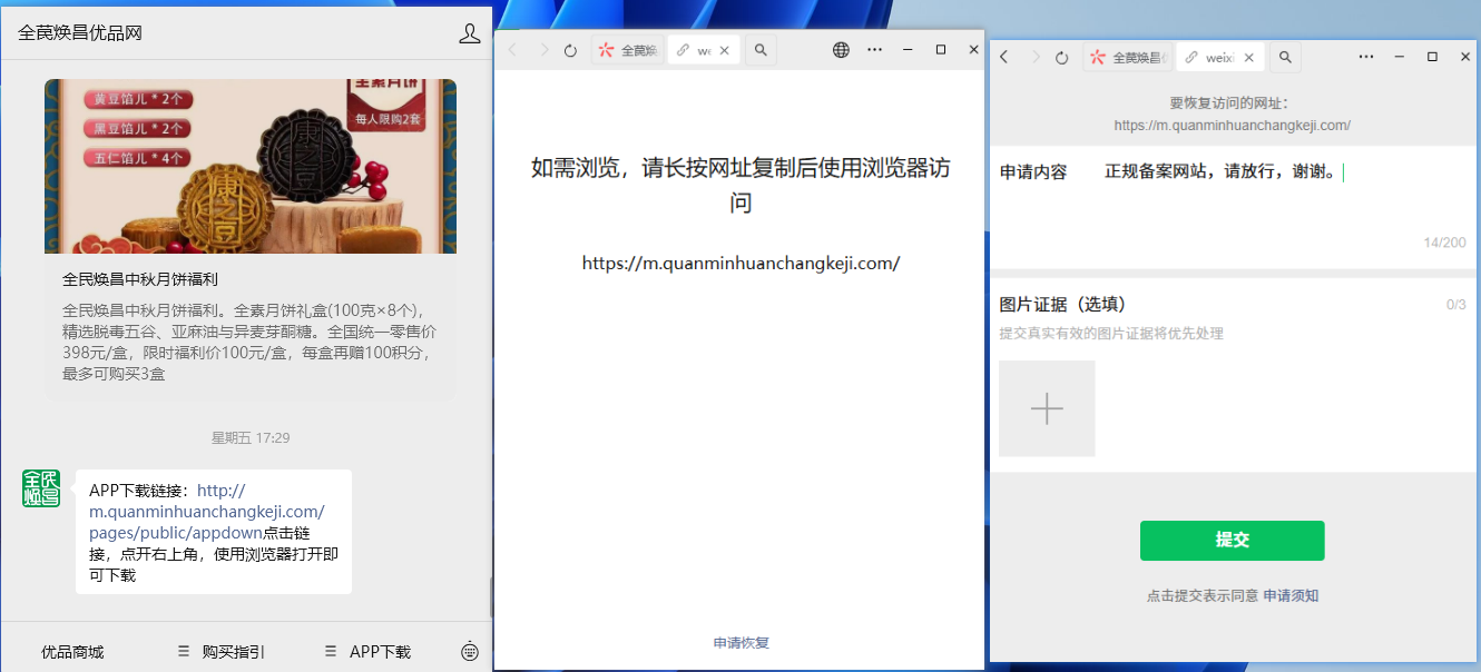 你好,经审核,域名【quanminhuanchangkeji.com】下的内容存在违反《微信外部链接内容管理规范》,暂无法恢复微信内直接访问的服务。