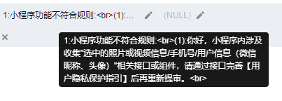 1:小程序功能不符合规则:<br>(1):你好,小程序内涉及收集"选中的照片或视频信息/手机号/用户信息(微信昵称、头像)"相关接口或组件,请通过接口完善【用户隐私保护指引】后再重新提审。<br>