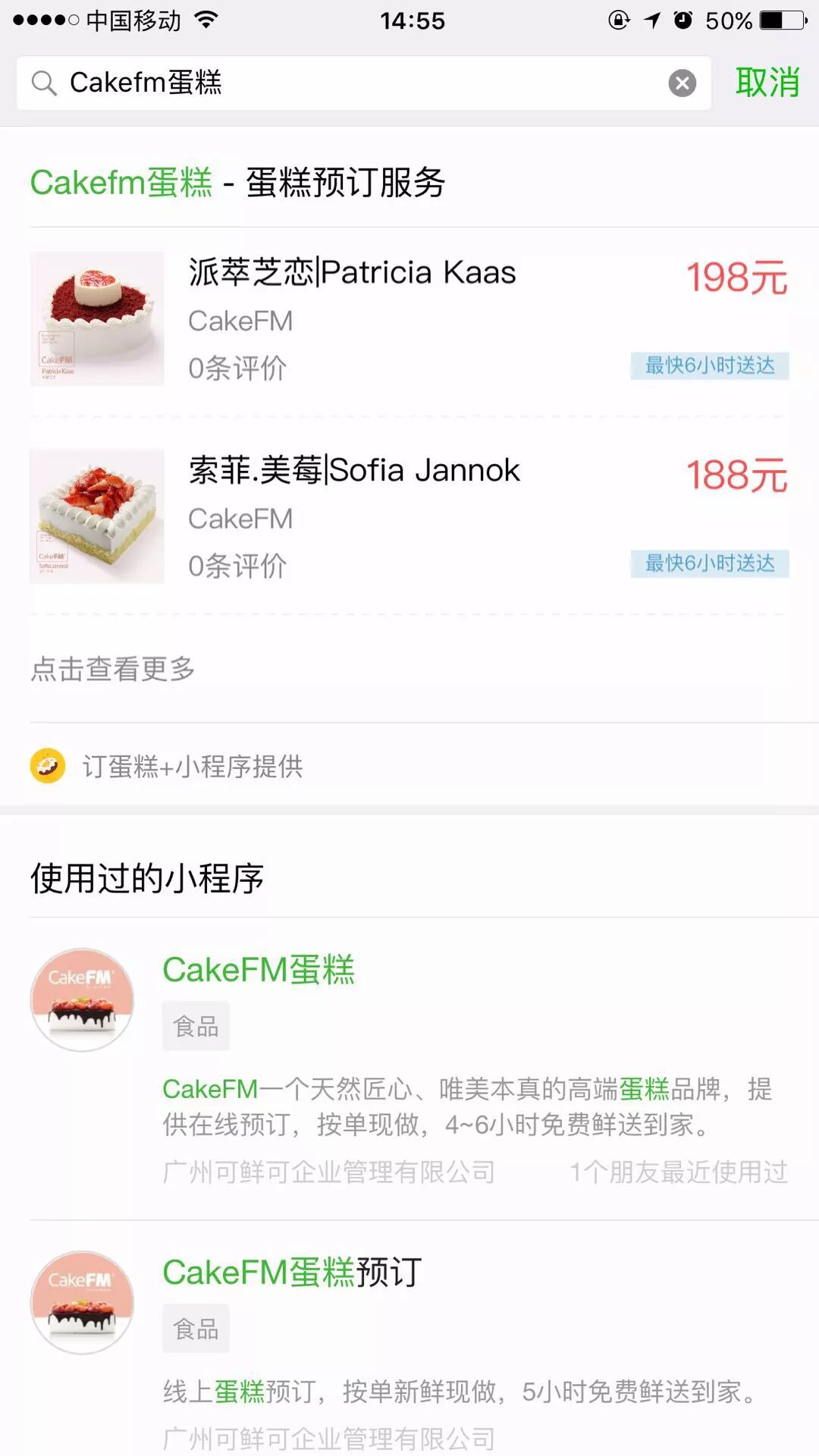 今天在微信的发现栏目搜索小程序时,用关键字 '订蛋糕' ,‘订蛋糕+’,'cakefm蛋糕',出来的结果居然把小程序里面的内容展示出来了(确切来说应该是几个推广的产品广告);