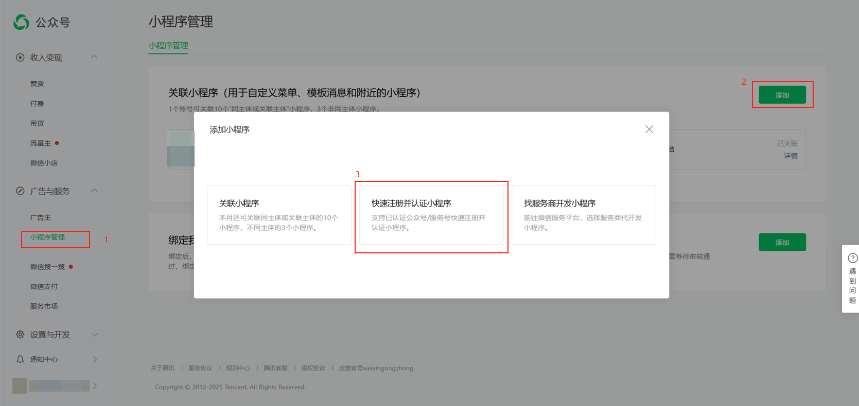第一步:登录公众号/服务号后台->小程序管理->添加->快速注册并认证小程序