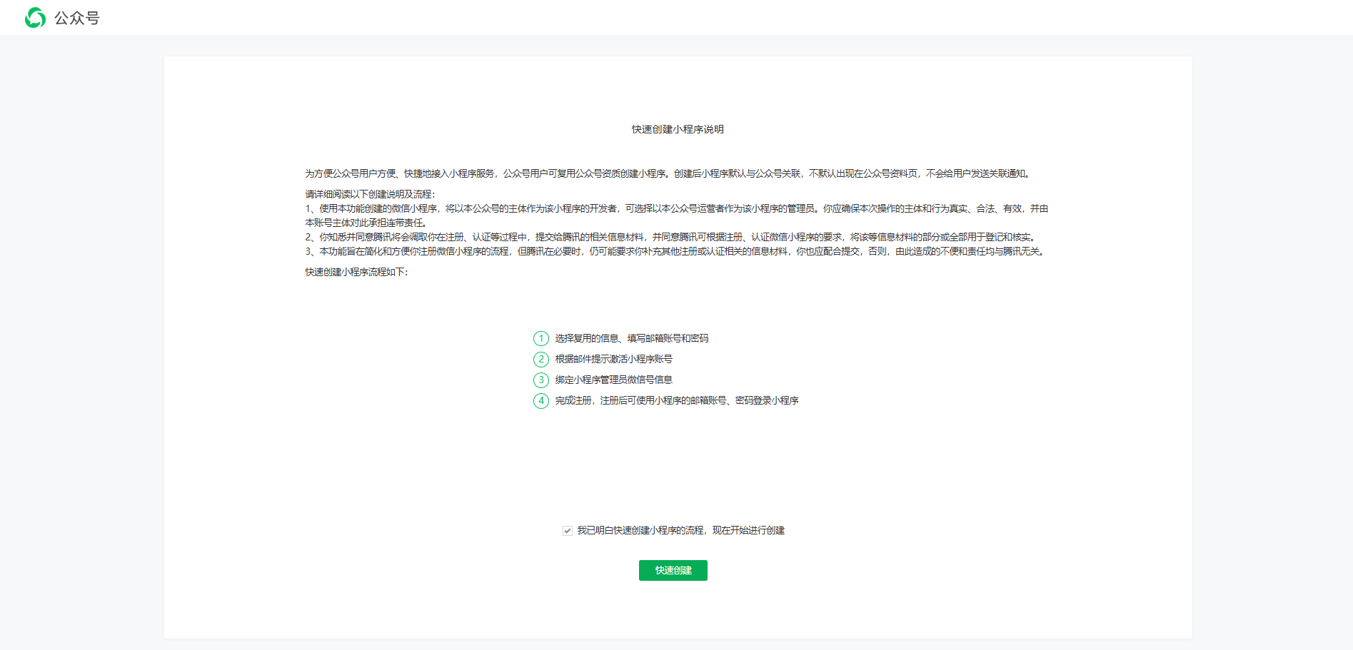 4、一个公众号/服务号若存在“待完成注册”的小程序,不可发起复用资质创建小程序;