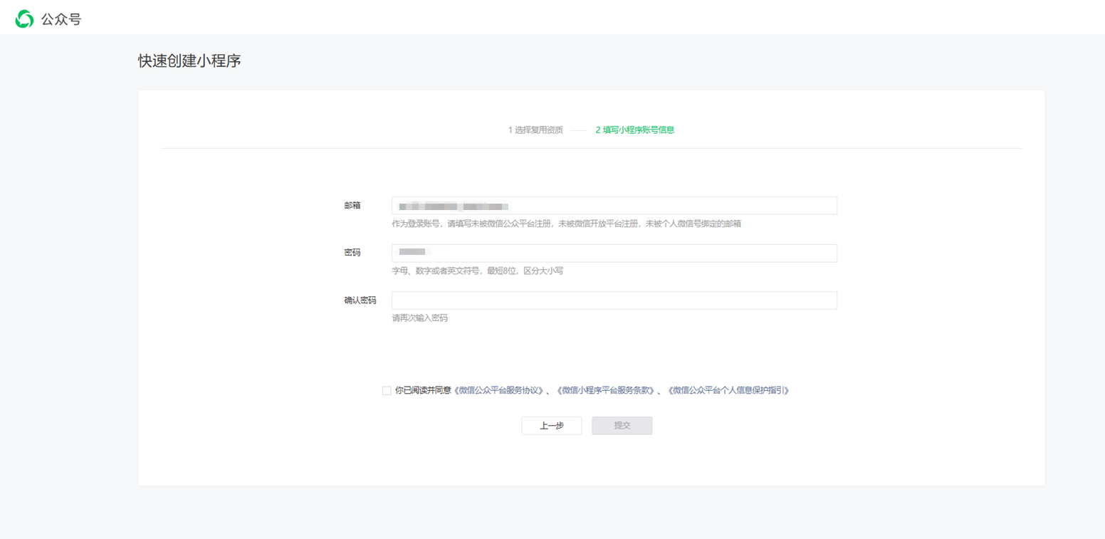 以上注册流程创建的小程序,不用再走小额打款验证主体。生成的账号具有独立的邮箱账号、密码,跟走正常注册流程注册的小程序具有一样的能力权限。